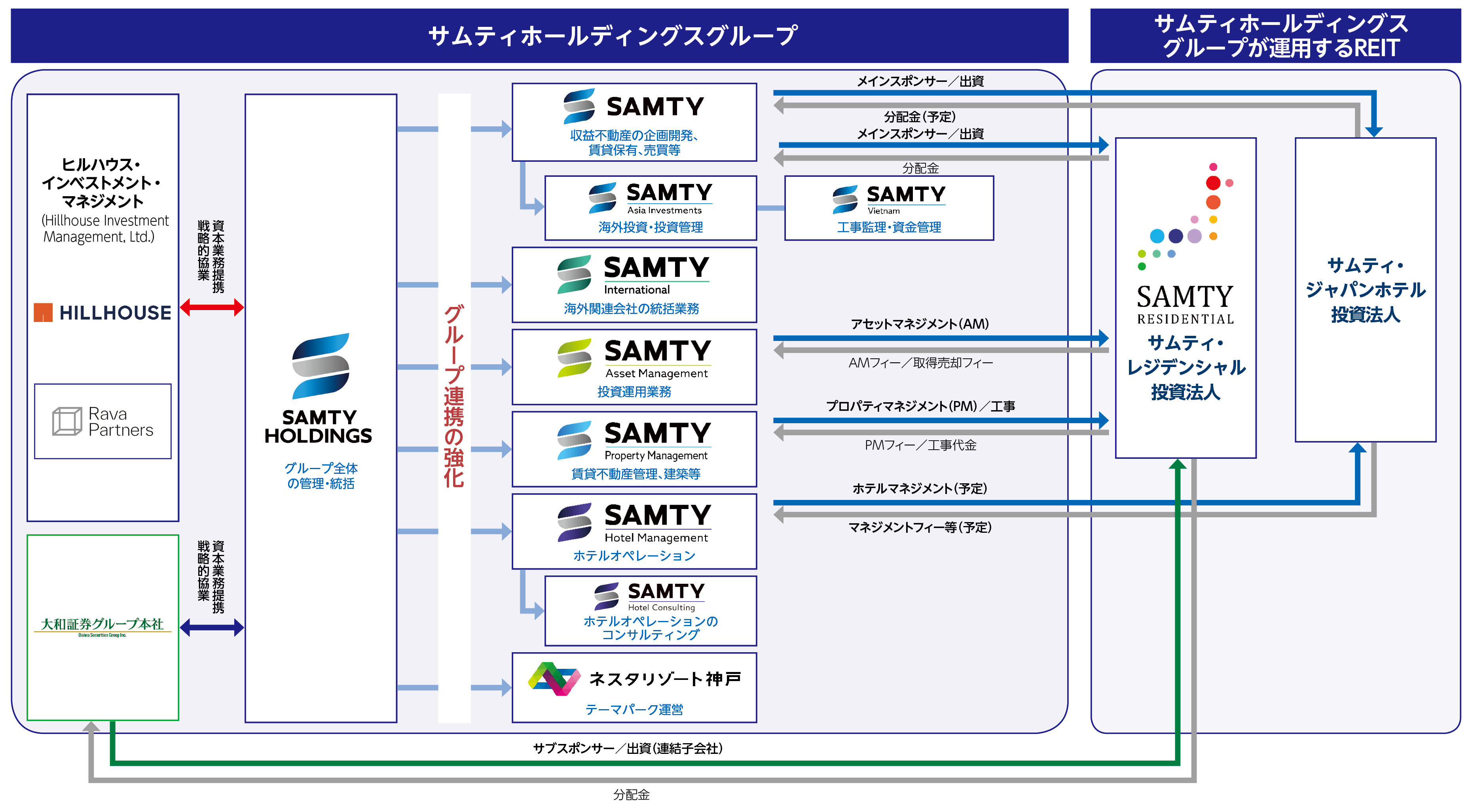 サムティグループは、賃貸マンション、ホテル、オフィ スビル等の用地仕入、企画開発、賃貸募集、物件管理、 保有および売却、REIT等のファンド運用、マネジメン トをグループ内で完結できる「総合不動産会社」とし て成長を続けています。